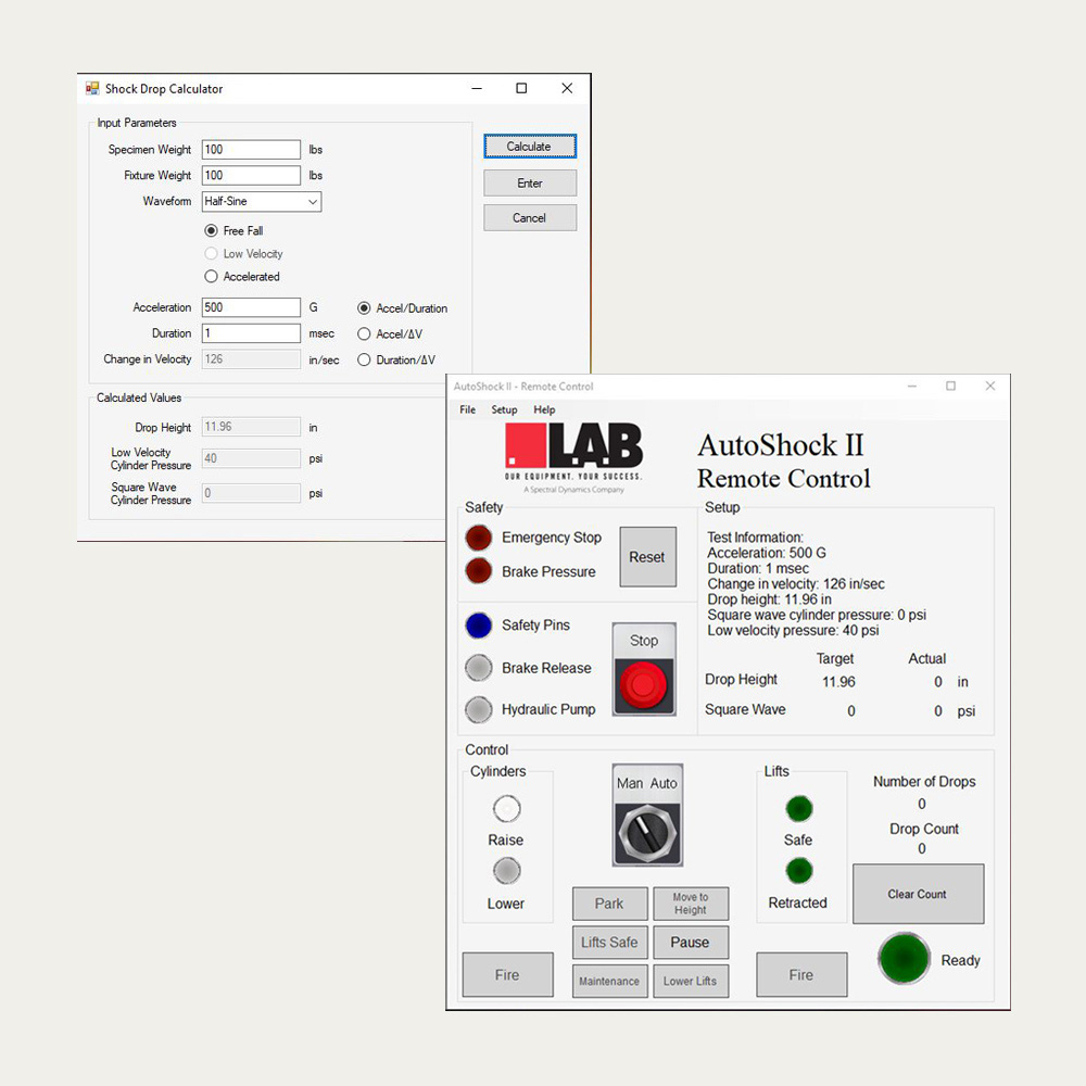 - An automated shock drop calculator simplifies the determination of drop heights and pressures to quickly achieve the operator’s requested shock pulses. Drop heights and pressures can be stored and easily retrieved.