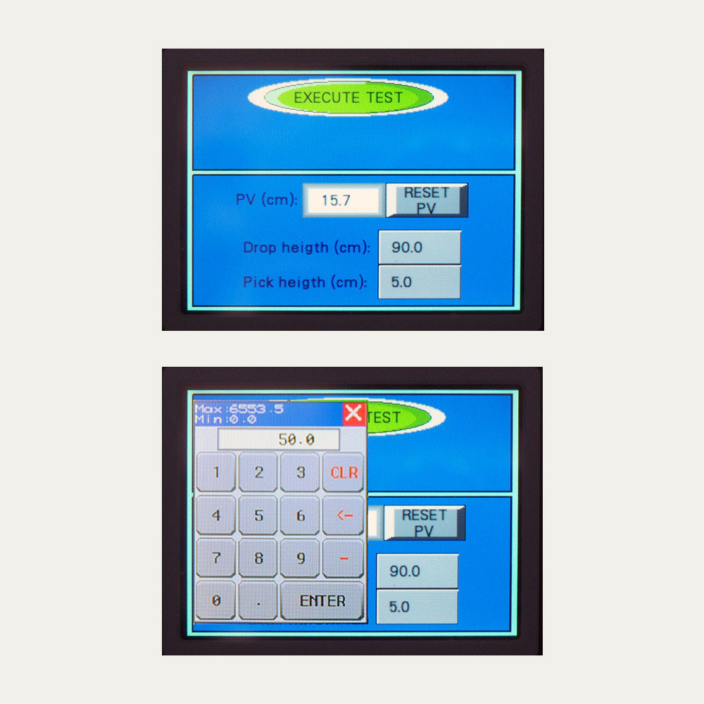 • DIGITAL Touch Screen Control and Visualization Module with activation buttons and programming of the impact drop height, you can choose the one you want between 0 and 1000 mm, and reset.