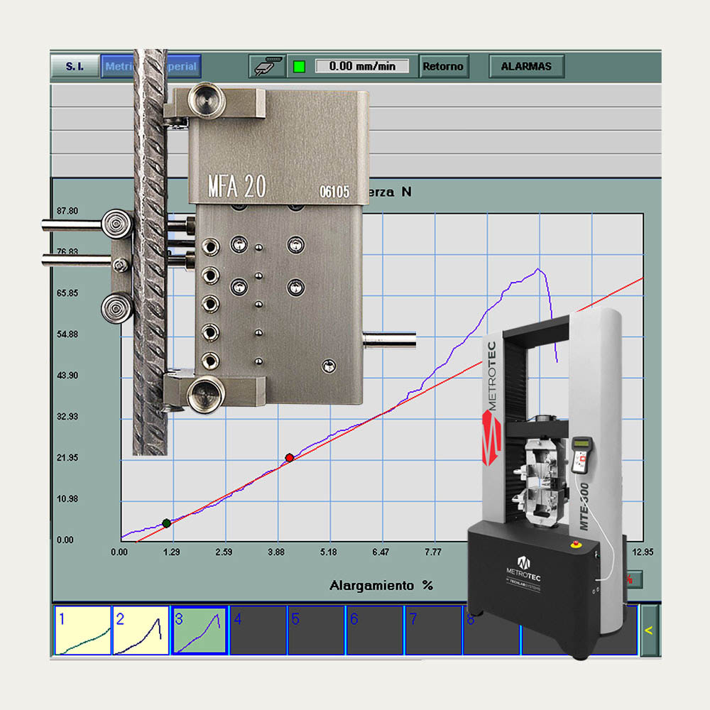 El extensómetro MFA 20 es adecuado para determinar el límite de elasticidad y una deformación uniforme para muestras de ensayo de más de 4 mm de diámetro y 15 mm de ancho.