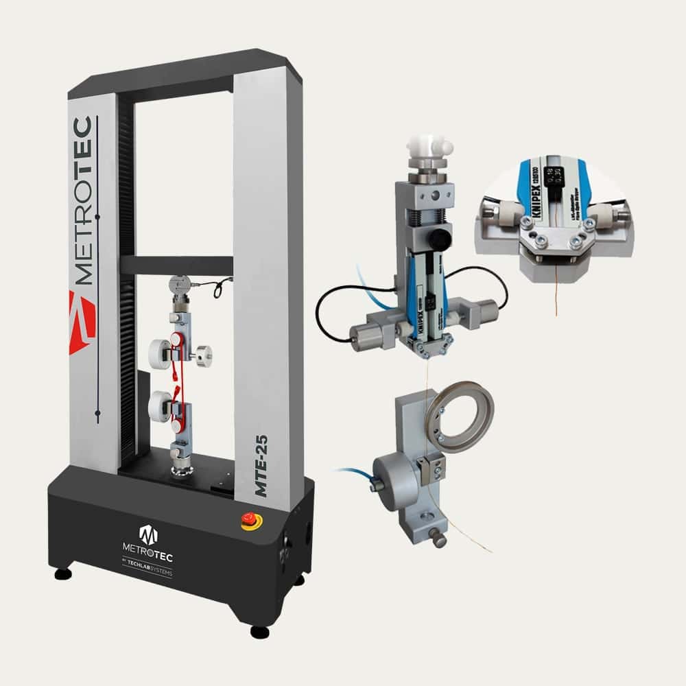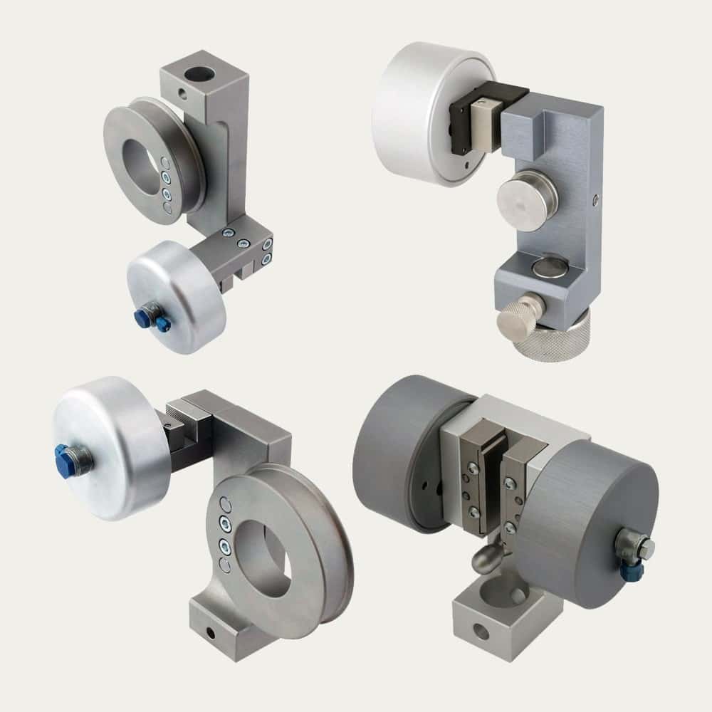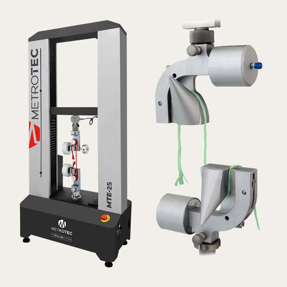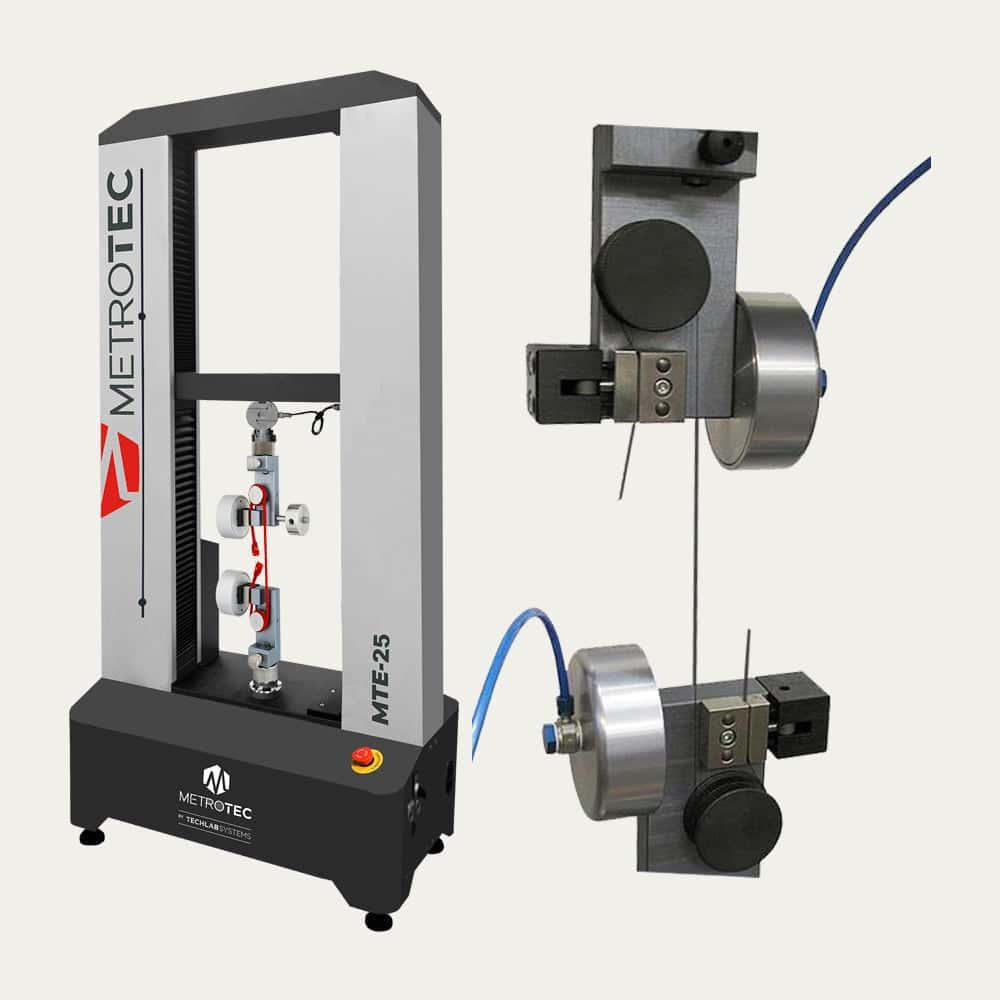 Pneumatic bollard grips for tensile tests on materials that are difficult to tie (ropes, narrow bands, cords, fine threads, strands, filaments, cables and fine wires...).