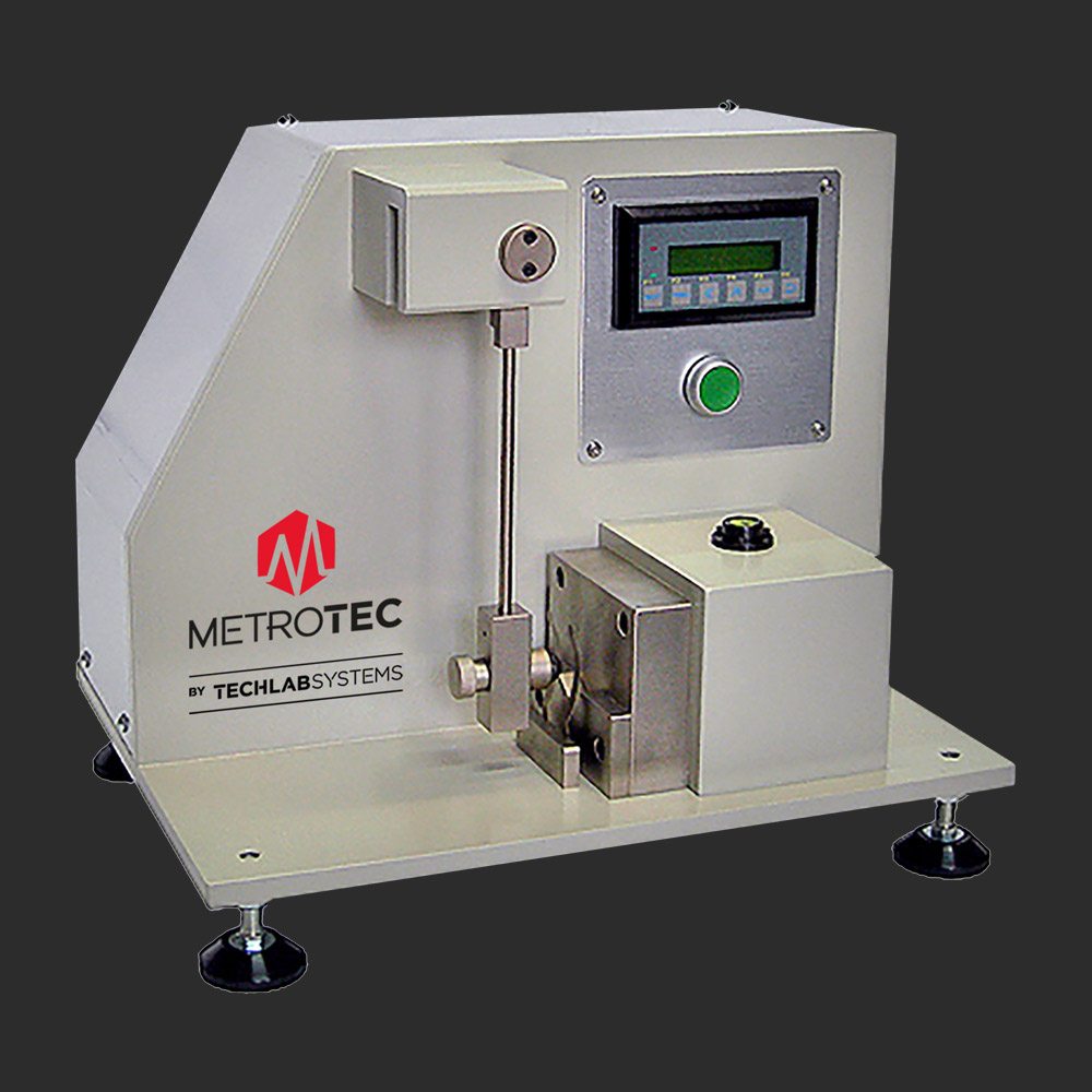 Laboratory equipment for testing rubber rebound elasticity for determining the rebound resilience of rubber compounds of rubber the hardness of which lies between 30 IRHD and 85 IRHD.