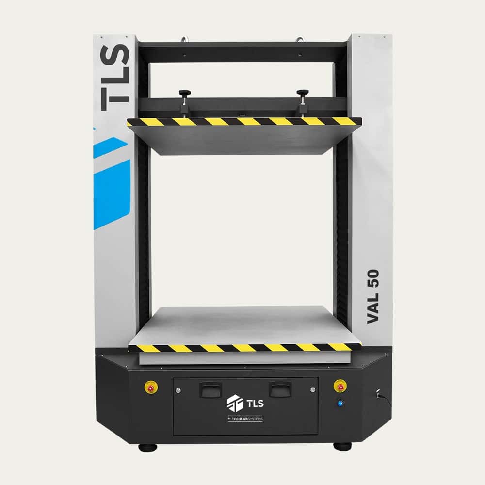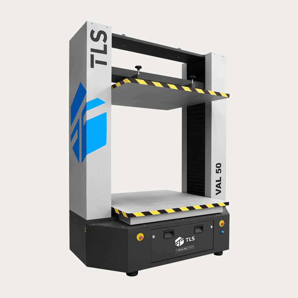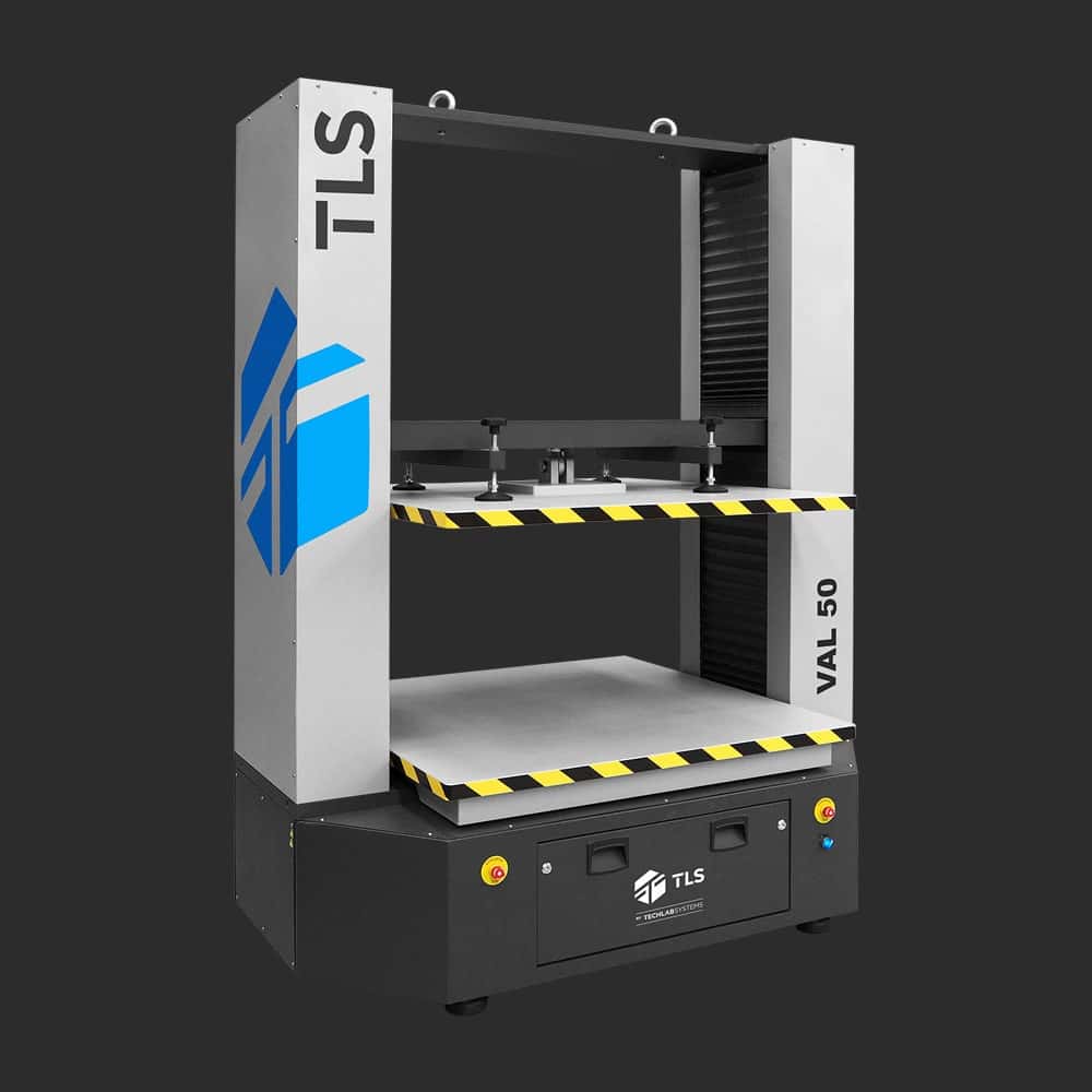 Machine to perform compression resistance test to big boxes, pallets, packing and packaging up to 1250 x 1250 mm size and 50kN force capacity.