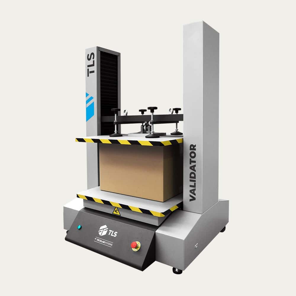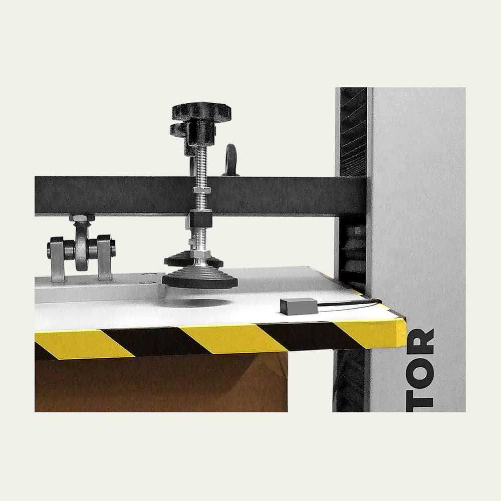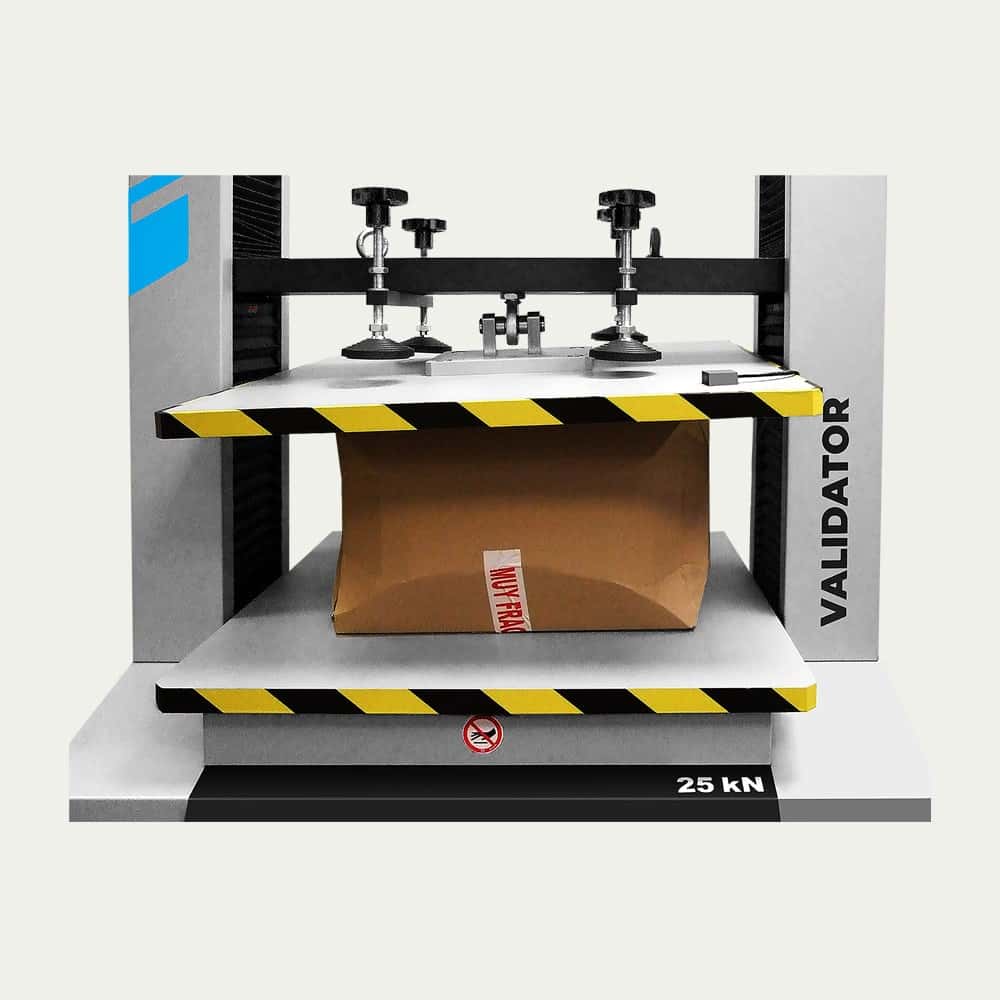 Machine to perform compression resistance test to small and middle size boxes, packing and packaging up to 800 x 800 mm size and 25kN force capacity.